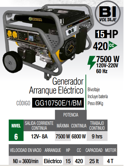 GENERADOR DE GASOLINA FOREST GARDEN GG10750E